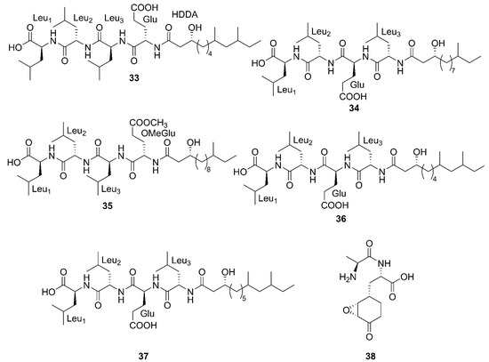 Three newfound linear lipopeptides named gageostatins A (28), B (29) and C (30), comprising of hepta-peptides and new 3-β-hydroxy fatty acids yielded by a marine-derived bacterium B. subtilis from the culture broth [35]. Furthermore, three novel linear lipopeptides possessing di- and tetrapeptides and a new fatty acid, gageotetrins A (31), B (32) and C (33), were isolated from a marine B. subtilis [57]. Four unreported lipopeptides, gageopeptides A (34), B (35), C (36), and D (37) were isolated and identified from a marine-derived bacterium B. subtilis, which consisted of tetrapeptides and 3-β-hydroxy fatty acids [58]. The fatty acid of 28, 31, 32 and 34 was identical and determined as a 3-β-hydroxy-11-methyltridecanoic acid. Likewise, compounds 29 and 37 both possessed the same fatty acid, 3-β-hydroxy-9,11-dimethyltridecanoic acid. Moreover, the fatty acid unit of 33 and 36 was 3-β-hydroxy-8,10-dimethyldodecanoic acid. In particular, the absolute stereochemistry at C-3 of the fatty acids of linear lipopeptides 28–37 is R configuration except 30. Additionally, the configuration of the amino acid residues in 28–37 was found to be L-form, while Val in 28–30 was D-form. Besides, bacilysin (38), another identified dipeptide, was isolated from seaweed-associated B. amyloliquefaciens MTCC 10456 in Microbial Type Culture Collection and Gene Bank (MTCC) of Chandigarh in India. Notably, this is the first report on the co-production and isolation of anti- Malassezia spp. chemicals from marine Bacillus species [44]. In conclusion, all linear Lipopeptide mentioned above were obtained from the Gageocho in the southern reef (Republic of Korea) except 38.