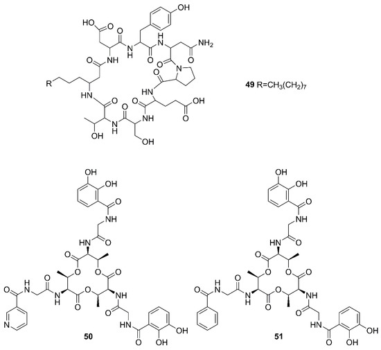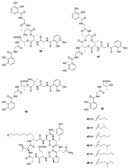 Two unreported compounds, bacillibactin B (39) and bacillibactin C (40), along with the known compounds Bacillibactin (41) and SVK21 (42), were discovered from Bacillus sp. named PKU-MA00093 from sponges, corals and sediments in the South China Sea. Additionally, compounds 43–48 were characterized as bacillomycin D, iso-C15 bacillomycin D, C15 bacillomycin D, iso-C16 bacillomycin D, C16 bacillomycin D, and anteiso-C17 bacillomycin D, respectively. They were isolated from Bacillus sp. PKU-MA00092 collected from sponges, corals and sediments in the South China Sea. Notably, this was the first time to report the structures of 45 and 47 with fully specified 1H NMR and 13C NMR data; their structures are highly similar except for the fatty acid moieties [60]. Compounds 45 and 47 in company with C14 bacillomycin D (49), were obtained from seaweed-associated B. amyloliquefaciens MTCC 10456 collected from seaweed in the MTCC, of Chandigarh, India [44]. Moreover, compounds 45 and 49 were also isolated from the methanol extract harvested from marine-derived B. megaterium CGMCC7086 obtained from the intestines of marine fish in the Yellow Sea of East China by two-step ultrafiltration and liquid chromatography-electronic spray ionization-tandem mass spectrometry (LC-ESI-MS/MS). Using a highly-efficient separation technique and identification method, more than 40 lipopeptides variants were identified from a Bacillus strain [23]. Besides, compound 47 was isolated from B. subtilis B38 strain [61]. Two unique bacillibactins, bacillibactins E (50) and F (51) were the first bacterial siderophores containing nicotinic and benzoic acid moieties isolated from a marine sponge Cinachyrella apion associated Bacillus sp. WMMC1349 collected from the west shore of Ramrod Key in Florida [24].