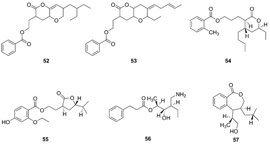Two novel compounds, O-heterocycle pyrans, 2-(7-(2-Ethylbutyl)-2,3,4,4a,6,7-hexahydro-2-oxopyrano-[3,2b]-pyran-3-yl)-ethyl benzoate (52) and 2-((4Z)-2-ethyl-octahydro-6-oxo-3-((E)-pent-3-enylidene)-pyrano-[3,2b]-pyran-7-yl)-ethyl benzoate (53) were obtained by repeated chromatography from the heterotrophic bacterium B. subtilis MTCC 10407 associated with brown seaweed Sargassum myriocystum on the southeast coast of India [64]. Additionally, 11-(15-butyl-13-ethyl-tetrahydro-12-oxo-2H-pyran-13-yl) propyl-2-methylbenzoate (54), 9-(tetrahydro-2-isopropyl-11-oxofuran-10-yl)-ethyl-4-ethoxy-2-hydroxybenzoate (55), 12-(aminomethyl)-11-hydroxyhexanyl-10-phenylpropanoate (56), and 7-(14-hydroxypropan-13-yl)-8-isobutyl-7, and 8 dihydrobenzo[c]oxepin-1(3H)-one (57) were isolated from a heterotrophic marine bacterium B. amyloliquefaciens. This strain was isolated from the brown seaweed Padina gymnospora collected from the intertidal zone of the Mannar Gulf in Peninsular India [63].