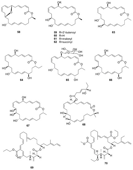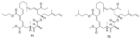 A new macrolactin derivative, 7,13-epoxyl-macrolactin A (58), along with four known macrolactins, 7-O-2′E-butenoyl macrolactin A (59), Macrolactin A (60), 7-O-malonyl macrolactin A (61), and 7-O-succinyl macrolactin A (62) were isolated from bacteria B. subtilis B5. It is worth emphasizing that this strain was extracted from deep-sea sediments at depths of 3000 m in the Pacific Ocean [66]. Compounds 60 and 62 were also isolated from seaweed-associated B. amyloliquefaciens MTCC 10456 in the MTCC of Chandigarh, India; this is the first report on the co-production and isolation of anti-Malassezia spp. compounds from marine Bacillus species [44]. In particular, the major difference between compounds 58 and 59–62 is in the epoxy ring. Compound 58 displayed a potent inhibitory effect on the expression of interleukin-1β (IL-1β), interleukin-6 (IL-6) and inducible nitric oxide synthase (iNOS), due to the existence of the epoxy ring [66]. Five novel 24-membered macrolactins named bamemacrolactins A (63), B (64), C (65), D (66) and E (67) were produced by B. siamensis, which was isolated from the gorgonian coral Anthogorgia caerulea gathered from Beihai city (Guangxi, China) [67]. The 7-O-methyl-5′-hydroxy-3′-heptenoate−macrolactin (68), a new macrolactin compound, was obtained from B. subtilis MTCC10403 associated with seaweed Anthophycus longifolius collected from the Gulf of Mannar of Peninsular India [68]. Compounds 69–72 were characterized as four homologous difficidin-type 21-membered macrocyclic lactone, isolated from a heterotrophoic B. amyloliquefaciens MTCC12713 associated with an intertidal macroalga Kappaphycus alverezii collected from the Gulf of Mannar in Peninsular India. In addition, they were established as 18,19-dihydro-6-hydroxy-8-propyl carboxylate difficidin, 5-ethoxy-28-methyl-(9-methyl-19propyl dicarboxylate) difficidin, (6-methyl-9-propyl dicarboxylate)-19-propanone difficidin, and 20-acetyl-(6-methyl-9-isopentyl dicarboxylate) difficidin, respectively [13].