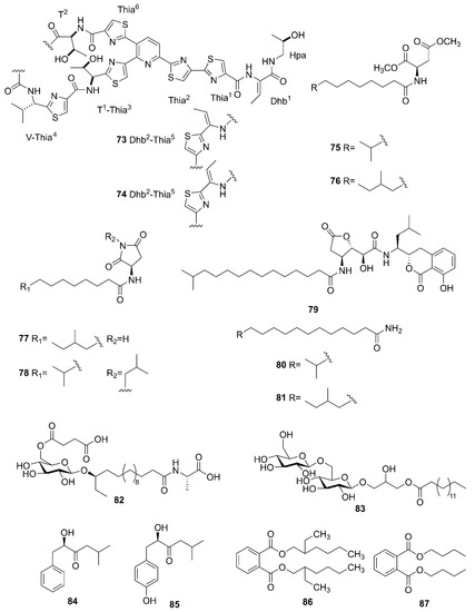 Figure 9 lists the other compounds produced by marine-derived Bacillus species. A novel thiopeptide named micrococcin P3 (73) and a known compound named micrococcin P1 (74) were isolated from the fermentation broth of B. stratosphericus [69]. Five new bacillamidins A (75), B (76), C (77), D (78) and E (79), along with two known synthetic analogs, bacillamidins F (80) and G (81), were isolated from the marine-derived B. pumilus strain RJA1515. This strain was extracted from deep-sea sediments at depths of 84 m collected in Bamfield in British Columbia [70]. Ieodoglucomide C (82) and ieodoglycolipid (83), two new glycolipids, were produced by the marine-derived B. licheniformis 09IDYM23 which was isolated from sediments at a depth 20 m collected at Ieodoin the southern reef of the Republic of Korea, both of which were obtained from the fermentation of this strain [71]. According to bioactivity-guided strategy, (-)-sattabacin (84) and (-)-4-hydroxysattabacin (85) were firstly discovered from Bacillus sp. (SCO-147) collected from marine sediments in Suncheon Bay of Korea [72]. Marine-derived B. subtilis AD35, gathered from marine water and sediment at the Alexandria sea shore in Egypt, could yield a previously reported but firstly isolated compound, Di-(2-ethylhexyl) phthalate (DEHP) (86) [73]. Additionally, compound 86 and dibutyl phthalate (DBP) (87) were isolated from the extract broth of marine-derived B. polymyxa L1-9, which was collected in a mud sample from the intertidal mudflat in the Lianyungang Port of China [74].