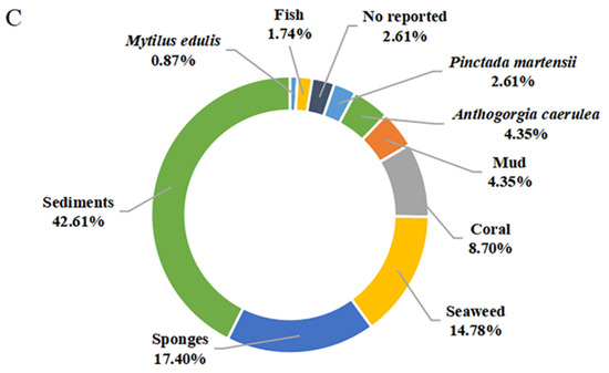 The secondary metabolites of marine-derived Bacillus species could be isolated from marine sediments, marine invertebrates (sponges, molluscs, and corals), and vertebrates (mainly fishes), as well as marine plants (mainly seaweed). Currently, there are 9 reported sources of Bacillus secondary metabolites. As shown in Figure 10C, a total of 49 compounds {1–7,11,15–18,28–37,39–48,58–62,75–85,86 (B. subtilis AD35)} originated from marine sediments, accounting for 42.61% of the sources of Bacillus species. In particular, the producing strains of 58–62 originated from deep-sea sediment at a depth of 3000 m, while the other strains of 75–83 originated from deep-sea sediment at depths less than 100 m. Moreover, the producing strains of 12–14, 86 (B. polymyxa L1-9), and 87 originated from mud. More precisely, the producing strains of 15–16 and 28–37 originated from the Republic of Korea’s southern reef. Twenty compounds (20–27,39–48,50,51), identified from marine sponges, accounted for 17.40% of the reported environmental sources of Bacillus secondary metabolites. It is worth noting that 20 belonging to diketopiperazine were isolated unprecedentedly from a sponge-associated microbe. Moreover, 45–49, 52–56 and 63–67 were also derived from coral, wherein 63–67, whose producing strains were obtained from the gorgonian coral A. caerulea, accounted for 4.35% of the reported environmental sources of Bacillus secondary metabolites. The 8–10 and 19 that originated from pearl oyster P. martensii and M. edulis, respectively, accounted for 3.48% of the reported ones. A total of 17 secondary metabolites {38,45,47,49,52–57,60,62 (B. amyloliquefaciens MTCC 10456) and 68–72} were identified from Bacillus residing in marine plants, accounted for 14.78% of the reported total amount. Thereinto, the producing strains of 52–57 originated from brown seaweed, while the producing strains of 45,47,49,60,62 (B. amyloliquefaciens MTCC 10456), 38,52–57 and 68–72 were collected from seaweed. In addition to these producing strains, only one Bacillus strain (B. megaterium CGMCC7086), which produced 45 and 49, was obtained from the intestines of marine fish and accounted for 1.74% of the reported total amount. Unfortunately, the environmental sources of the producing strain of 47 (B. subtilis B38), 73 and 74 (B. stratosphericus) were not described. From the above analysis, it can be concluded that marine sediments and sponges are more abundant sources of productive strains of marine-derived Bacillus, and which deserved much more attention in subsequent chemical studies.