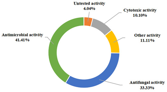 In this view, most of the presented compounds display significant biological activities such as antimicrobial, antifungal, and anticancer. These compounds are also effective to a certain extent in inhibiting the attachment of diatoms, the expression of various cytokines inducible and nitric oxide exhibited siderophore activity, as well as enzyme inhibitory activity. Among them, antimicrobial (41.41%), antifungal (33.33%), and anticancer (10.10%) activities were dominant in evaluating the pharmacological potential of these metabolites (Figure 11). Notably, a high proportion (54.84%) of the 49 marine sediment-derived metabolites exhibited moderate to potent bioactivity. Based on this, these impressive bioactivities indicate their potential to be new antibiotic candidates, biological control agents, and hypopigmenting agents.