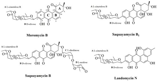 - Abdelfattah, M.S.; Kharel, M.K.; Hitron, J.A.; Baig, I.; Rohr, J. Moromycins A and B, isolation and structure elucidation of C-glycosylangucycline-type antibiotics from Streptomyces sp. KY002. J. Nat. Prod. 2008, 71, 1569–1573. [Google Scholar] [CrossRef] [PubMed]