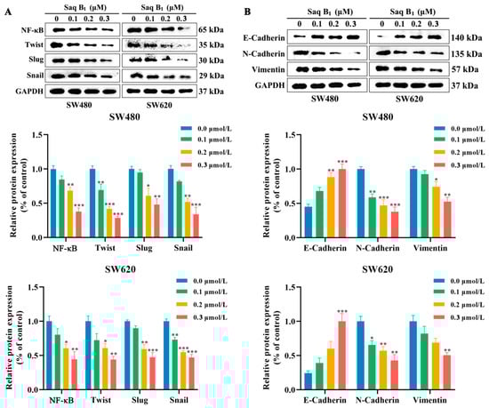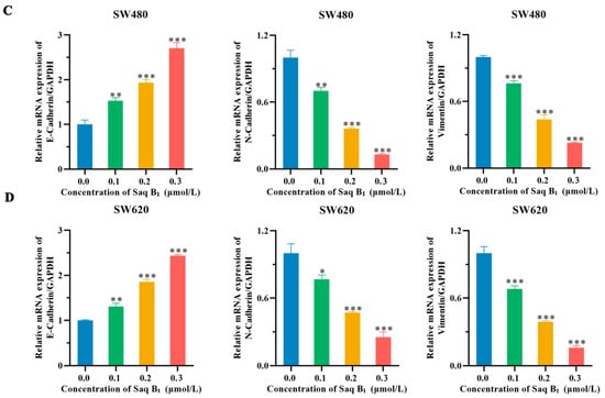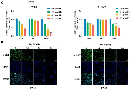 2.4. Saq B1 Inhibits the Migration and Invasion of Human CRC Cells by Regulating the PI3K/AKT Pathway