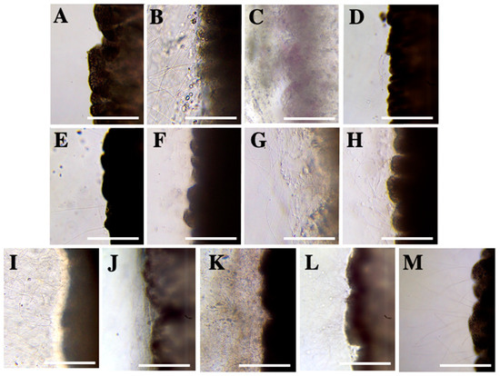 Screening of activator solutions: (A) Seawater, a neutral solution used as a control, (B) ammonia, (C) barium chloride, (D) sodium bicarbonate in seawater, (E) sodium bicarbonate in distilled water, (F) sodium chloride, (G) papain, (H) acetic acid, (I) bleach, (J) carbonated cola, (K) lemon juice, (L) scented ammonia, and (M) vinegar. Note the discharged tubules with activator solutions (B–M) compared with seawater, a neutral solution (A). Scale bars: 0.5 mm.