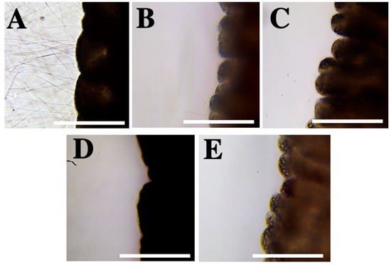 Inhibitor solutions identified after chemical stimulation with 5% acetic acid (test 2): (A) Acetic acid (chemical stimulator). Note all tubules discharged after its application; (B) Butylene glycol, a reducer compound; (C) 1.5% hydroxyacetophenone in distilled water + butylene glycol (1:1); (D) 10% lidocaine in ethanol and (E) 3% Symsitive® in butylene glycol, inhibitory solutions. Scale bars: 0.5 mm.