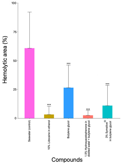 After the identification of inhibitory solutions with TSA, venom activity assays were conducted using live tentacles in ex vivo TSBAA with only the reducer and inhibitor solutions (Table 2). Seawater, a neutral solution (Table 2) that was used as a control, obtained a hemolytic area of 60.77 ± 31.38% (Figure 3 and Figure 4A). All the solutions identified as inhibitors in the previous assay (Section 2.2.1) decreased the hemolytic area after the sting process. The smallest hemolytic areas were obtained after incubation with 10% lidocaine in ethanol (3.30 ± 7.19%), 1.5% hydroxyacetophenone in distilled water + butylene glycol (2.48 ± 4.54%), and 3% Symsitive® in butylene glycol (11.00 ± 17.66%) (Figure 3 and Figure 4B,D,E). Butylene glycol obtained a value of 26.54 ± 19.64% for the hemolytic area (Figure 3 and Figure 4C). Significant differences were found between seawater (control) and all the compounds (*** p ≤ 0.001) (ANOVA test) (Figure 3). Statistical data can be consulted in Supplementary Material Tables S1 and S2.