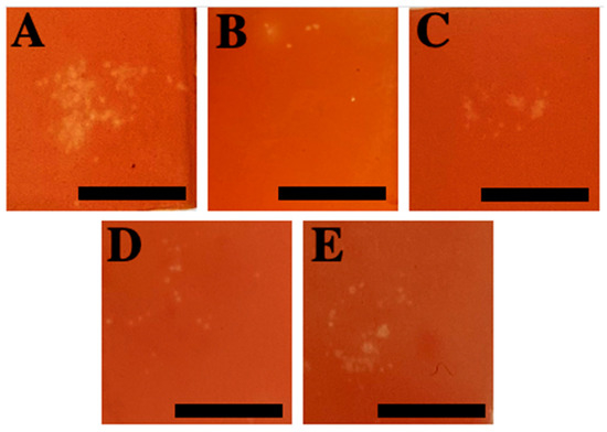 Hemolytic areas produced after 22 h of the sting of Pelagia noctiluca using the TSBAA method in: (A) seawater (control), (B) lidocaine in ethanol, (C) butylene glycol, (D) 1.5% hydroxyacetophenone in distilled water + butylene glycol (1:1) and (E) 3% Symsitive® in butylene glycol. Scale bars: 10 mm.