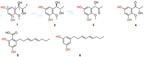 Furthermore, two additional known phenolic metabolites were assigned to be 2,4-dihydroxy-6-((3E,5E)-nona-3,5-dien-1-yl)-benzoic acid (5) [,] and 5-[(3E,5E)-3,5-nonadienyl]-1,3-benzenediol (6) [], respectively, on the basis of the careful comparisons of their NMR data and specific rotations with those reported in the literature.