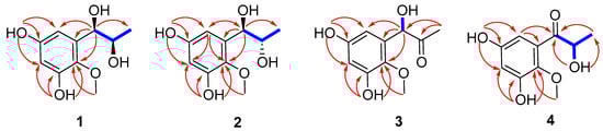 Selected 1H-1H COSY (blue bold) and HMBC (red arrow) correlations of 1–4.