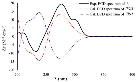 Experimental ECD spectrum of 3 in methanol and the calculated ECD data of 7S-3 and 7R-3.