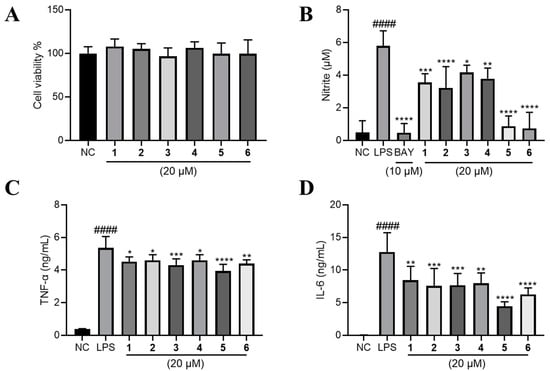 The effects of compounds 1–6 on LPS-induced inflammation on RAW264.7 cells. (A) The effect of 1–6 on the cell viability of RAW264.7 cells. LPS (1 μg/mL) was added to all groups except normal control (NC, 0.2% DMSO, v/v). The production of (B) NO, (C) TNF-α and (D) IL-6 were measured. Mean ± SD (n = 6); #### p < 0.0001 LPS vs. NC; * p < 0.05, ** p < 0.01, *** p < 0.001, **** p < 0.0001 vs. LPS.