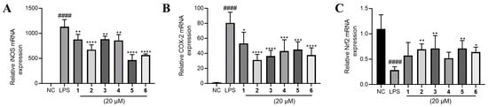 The effects of compounds 1–6 on mRNA expression of (A) iNOS, (B) COX-2 and (C) Nrf2 in LPS-stimulated RAW264.7 cells. LPS (1 μg/mL) was added to all groups except normal control (NC, 0.2% DMSO, v/v). Mean ± SD (n = 6); #### p < 0.0001 LPS vs. NC; * p < 0.05, ** p < 0.01, *** p < 0.001, **** p < 0.0001 vs. LPS.