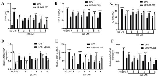 The Nrf2-dependent anti-inflammation effect of 1–6 on LPS-stimulated RAW264.7. (A) NO production, (B) TNF-α and (C) IL-6 were measured. mRNA expression of (D) Nrf2, (E) COX-2 and (F) iNOS were measured. LPS (1 μg/mL) was added to all groups except normal control (NC, 0.25% DMSO, v/v). ML385 was added at 5 μM. Mean ± SD (n = 6); * p < 0.05, ** p < 0.01, *** p < 0.001, **** p < 0.0001 LPS vs. NC, LPS + ML385 vs. LPS.