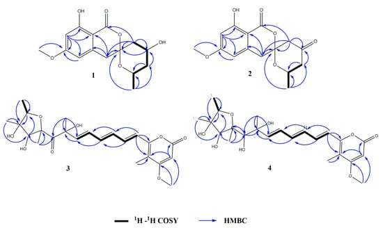 Key HMBC and 1H-1H COSY correlations of 1–4.