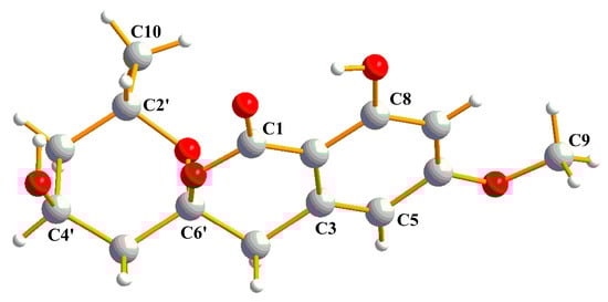 Compound 1 was obtained as a white powder. Its molecular formula was determined to be C15H17O6 from the HRESIMS (m/z 293.1024 [M − H]− calcd for C15H17O6, 293.1031), indicating 7 degrees of unsaturation. The IR spectrum of 1 at 3696, 1646, and 1585 cm−1 suggested the presence of hydroxyl, carbonyl, and aromatic ring groups. The 13C NMR data in combination with HMQC spectra (Table 1) displayed one methyl carbon at δC 20.5, one methoxyl carbon at δC 55.2, three methylene carbons at δC 39.1, 38.9, and 38.5, four methine carbons at δC 106.8, 99.3, 63.4, 63.0, and six nonprotonated carbons at δC 169.2, 166.7, 164.4, 140.2, 104.6, 101.0. Analysis of the 1H NMR spectrum of 1 revealed two aromatic protons at δH 6.35 (d, J = 2.1), 6.34 (s), indicating the presence of a tetrasubstituted phenyl. Two oxygenated methine protons signal at δH 4.39 (m) and 4.17 (m), three aliphatic methylenes at δH 1.53 (m), 1.78 (m), 1.87 (dd, J = 4.08, 15 Hz), 2.21 (dt, J = 15, 2.2 Hz), 2.95 (d, J = 16.5 Hz), and 3.17 (d, J = 16.5 Hz), one methoxyl at δH 3.82 (s), and one methyl at δH 1.07 (d, J = 6.3 Hz) were also recorded in this spectrum. The above spectroscopic features indicated that 1 belonged to the isocoumarin class. Further analysis of HMBC spectrum (Figure 2), the correlations from H-7 to C-2 (δC 101.0)/C-5 (δC 106.8)/C-6 (δC 166.7)/C-8 (δC 164.4), from H-5 to C-2/C-6, from H-4 to C-2/C-3 (δC 140.2)/C-6’ (δC 104.6), from H-9 to C-6 suggested that 1 was an isocoumarin derivative with a hydroxyl group at C-8 and a methoxy group at C-6. The 1H-1H COSY correlations between H-2’, H-3’, H-4’, H-5’, and H-10 combined with the HMBC correlations from H-5’ to C-3’ (δC 38.5)/C-4’ (δC 63.4), from H-3’ to C-2’ (δC 63.0)/C-10 (δC 20.5), from H-10 to C-2’/C-3’ suggested an aliphatic fragment of -CH2-CH-CH2-CH-CH3. Furthermore, the key HMBC correlations from H-5’ to C-1/C-4/C-6’, from H-4’ to C-6’, and from H-10 to C-6’, together with the unsaturation of compound 1 and the chemical shift of C6’ (δC 104.6) indicated the presence of the spiroketal ring C. Therefore, the planar structure of 1 was shown in Figure 1. The absolute configuration of 1 was further verified by the X-ray diffraction analysis of a single crystal using Cu Kα as 6’S, 2’S, 4’S-1 (Figure 3). Hence, the structure of compound 1 was identified as 6′S, 2’S, 4′S-1 and named penicillol A.