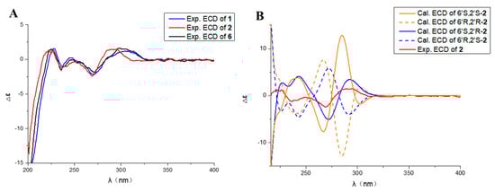 (A) Experimental ECD spectra of compounds 1, 2, and 6. (B) Comparison between the experimental and calculated ECD spectra of 2.