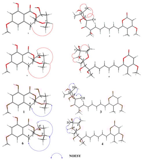 Key NOESY correlations of 1, 3, 4, and 6.