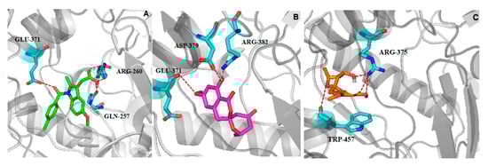 Inhibition of NO overproduction is usually the result of inhibition of iNOS enzyme expression or activity [,]. In order to investigate the inhibitory mechanism of compound 2 on NO production, the interaction and binding mode between compound 2 and iNOS (PDB: 3E6T) [], molecular docking study was carried out using AUTODOCK 4.2.6 modeling software. Docking procedure was validated by docking of ligand indomethacin (positive drug) in the active site of iNOS, and root-mean square deviation (RMSD) of 0.12 Å to the X-ray structure. The results revealed that the lowest energy of compound 2 (−7.49 Kcal/mol) was lower than that of positive drug indomethacin (−7.45 Kcal/mol), and the lowest energy of compound 1 (−7.36 Kcal/mol) was higher than that of positive drug. Further observations showed indomethacin formed a hydrogen bond with key amino acid residues GLU-371, two hydrogen bonds with amino acid residues ARG-260, and a hydrogen bond with GLN-257 in the iNOS active pocket (Figure 6A). Compound 2 formed a hydrogen bond with the key amino acid residue GLU-371 through the methoxy group, two hydrogen bonds with the residue ASP-379 and ARG-382 by the hydroxyl group in the iNOS active pocket (Figure 6B), respectively. Notably, for compound 1, while the carbonyl group in compound 2 at the 4’ position changed to the hydroxyl group, the optimized conformation of 1 was different from that of compound 2 and could not enter into the iNOS active pocket to form hydrogen bonds with the key amino acid residues (Figure 6C). As a result, compound 1 had no production inhibition activity (Table 3).