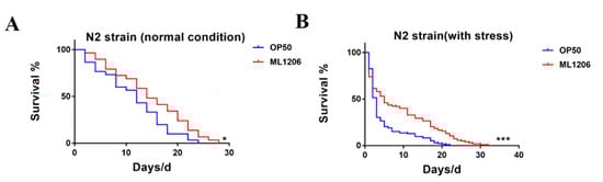 Effect of ML1206 on the lifespan of C. elegans: (A) survival curve of N2 nematodes fed with OP50 or ML1206 under normal condition; and (B) survival curve of N2 nematodes fed with OP50 or ML1206 exposed to oxidative stress induced by H2O2. The numbers of nematodes are calculated in Kaplan-Meier diagrams, and statistical significance was evaluated by the log-rank test. p < 0.05 is considered statistically significant. (*: p < 0.05; ***: p < 0.001).