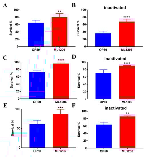 Effect of ML1206 on the oxidative and heat stress in C. elegans: (A) survival of nematodes fed with live OP50 and ML1206 under PQ-induced oxidative stress; (B) survival of nematodes fed with inactivated OP50 and ML1206 under PQ induced oxidative stress; (C) survival of nematodes fed with live OP50 and ML1206 under H2O2 induced oxidative stress; (D) survival of nematodes fed with inactivatedOP50 and ML1206 under H2O2 induced oxidative stress; (E) survival of nematodes fed with live OP50 and ML1206 under heat stress; and (F) survival of nematodes fed with inactivated OP50 and ML1206 under heat stress. All exposures were performed in nematodes after ML1206 or OP50 feeding for 48 h. Results are represented as mean ± SEM of three independent experiments and were statistically analyzed by an unpaired Student’s t-test. (**: p < 0.01; ***: p < 0.001; ****: p < 0.0001).