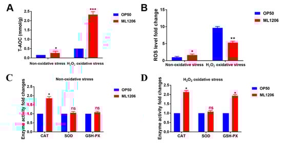 The FRAP assay is a method to measure the reduction ability of ferric iron in plasma and tissues and is often used to evaluate the total antioxidant ability (T-AOC) []. The activities of antioxidant enzymes, for example, Superoxide Dismutase (SOD), Catalase (CAT), and Glutathione peroxidase (GSH-PX), are also commonly used indicators for evaluating antioxidant capacity []. ML1206 strain have no obvious T-AOC activity and ability to scavenge free radicals in vitro (Figures S2 and S3), but ML1206 showed well antioxidant activity in C. elegans and enhanced oxidative stress resistance of them. Here, to further explore how ML1206 enhance resistance to oxidative stress of C. elegans, we detected the T-AOC, CAT, SOD, and GSH-PX activities of nematodes fed with OP50 and ML1206 with or without oxidative stress. The results showed that the T-AOC of nematodes fed with ML1206 was significantly increased to 1.6 fold in the absence of stress (Figure 3A). Also, it was also shown that the T-AOC in C. elegans fed with ML1206 was enhanced compared with the control group fed with OP50 in the presence of stress, suggested by a 3.6-fold increase. The CAT enzyme activity of the nematodes fed with ML1206 was significantly higher than that of the control under non-oxidative stress (Figure 3C). The CAT and GSH-PX activities of the nematodes fed with ML1206 were significantly higher than those of the control (Figure 3D). In conclusion, the enhanced antioxidant capacity of nematodes fed with ML1206 may be related to the increase of the antioxidant enzymes’ activity.