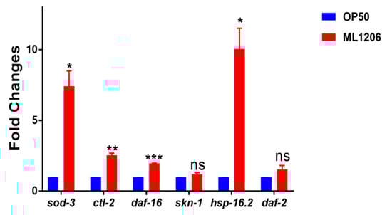 Effect of ML1206 on the relative expression of the antioxidant-related gene in C. elegans. The mRNA level of genes was quantified by the real-time PCR, which was normalized with that of act-1 as a control; p < 0.05 is considered statistically significant. (ns: No significant difference, *: p < 0.05; **: p < 0.01; ***: p < 0.001).