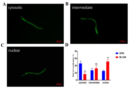 Effect of ML1206 on the DAF-16::GFP nuclear location in C. elegans: (A) representative images of the DAF-16::GFP location mainly in the cytoplasm of C. elegans; (B) representative images of the DAF-16::GFP location in the cytoplasm and nucleus of C. elegans; (C) representative images of the DAF-16::GFP location mainly in the nucleus of C. elegans; and (D) DAF-16::GFP localization in different areas of nematodes fed with OP50 and ML1206. The results are represented as mean ± SEM from three repeated experiments with 10 nematodes in each group, and the statistical significance is evaluated by Student’s t-test. (**: p < 0.01; ns: p > 0.05). Scale bar = 200 µm.