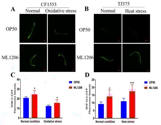 Representative images of the SOD-3::GFP and HSP-16.2::GFP expression of transgenic strains in the presence or absence of stress: (A) representative images of the SOD-3::GFP expression in the presence or absence of oxidative stress of transgenic strain CF1553; (B) representative images of the HSP-16.2::GFP expression in the presence or absence of heat stress of transgenic strain TJ375; (C) relative fluorescence intensity of OP50 and ML1206 group in the presence or absence of oxidative stress in transgenic strain CF1553; and (D) relative fluorescence intensity of OP50 and ML1206 group in the presence or absence of heat stress in transgenic strain TJ375. The results are represented as mean ± SEM from three repeated experiments with 10 nematodes in each group, and the statistical significance is evaluated by Student’s t-test. (*: p < 0.05; ***: p < 0.001). Scale bar = 200 µm.