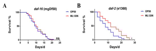 Effect of ML1206 on the lifespan of DAF-16 and DAF-2 mutants: (A) lifespan of GR1307 DAF-16 (mgf50) strain fed with ML1206 and OP50; and (B) lifespan of DR1572 DAF-2 (e1368) strain fed with ML1206 and OP50. The numbers of nematodes were calculated in Kaplan–Meier diagrams, and statistical significance was evaluated by the log-rank test. p < 0.05 is considered statistically significant. (*: p < 0.05; ns: p > 0.05).