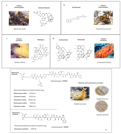 Approved marine drugs for cancer treatment and their organism of origin. (a,b) Structures and names of compounds derived from marine sponges; (c,d) structure and names of compounds obtained from tunicates; and (e) structures of molecules obtained from the relationship between mollusks and cyanobacteria with specific associated monoclonal antibodies.