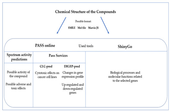 Schematic representation of the pipeline used for the bioinformatic predictions. Selected compounds were analyzed with PASS online and ShinyGo, using three possible formats for the analysis (SMILE, Mol file and Marvin JS). PASS online gives the first prediction about the activity, and then, there are other additional services (CLC-pred and DIGEP-pre are the used ones). ShinyGo is the other used tool for GO predictions.