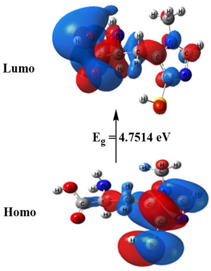 The computed total energy of ovothiol A is −986.465 Hartree, the highest occupied molecular orbital (HOMO) energy is −5.6010 eV, the lowest unoccupied molecular orbital (LUMO) energy is −0.8496 eV and the dipole moment is 6.9314 Debye. The higher total energy negativity indicates compound stability. Also, the energy gap (Eg) = ELUMO − EHOMO = 4.7514 eV, Figure 2 and Table 2. Many reactivity descriptors such as ionization potential (I), electron affinity (A), Electronegativity (χ), chemical potential (μ), hardness (η), softness (S) and electrophilicity index (ω), all derived from the HOMO and LUMO energies, proposed to comprehend many reactivity-related features of chemical processes, Table 2.