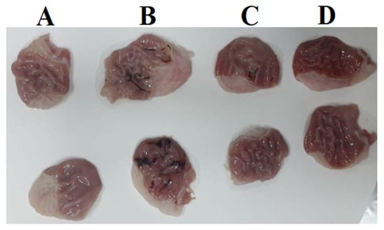 After collecting the gastric juice by cutting open the stomachs, the samples were centrifuged for 10 min at 3000 rpm to remove the solids from the liquid, and the supernatant volume was measured. A pH meter was used to measure the pH level of the gastric juice. Stomachs were inspected for ulcers using magnification (×10). Methods used to evaluate the ulcer index included: Below 1 mm = 1 point, 1–2 mm = 2 points, and >3 mm = 3 points for ulcer length. The ulcer index was calculated by taking the total number of points and dividing it by 10 (lens magnification) [52].