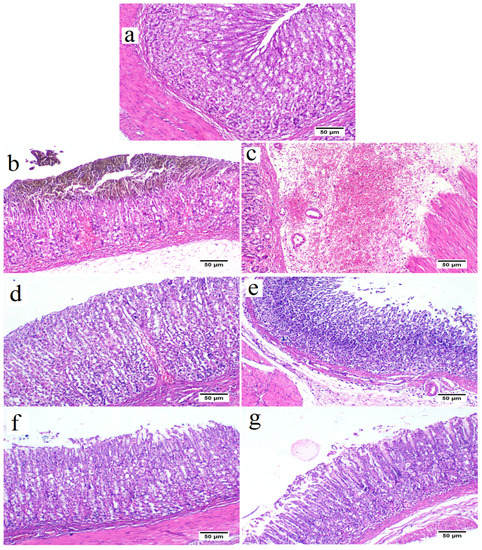 The control group revealed a standard histological structure characterized by a long tubular gastric gland (acini) in the mucosal layer that extended deep into the lamina propria and was covered by simple columnar epithelium (Figure 5a). The gastric acini showed the digestive enzyme-secreting zymogenic cells (chief cells) and the gastric acid-secreting parietal cells (oxyntic cells). The submucosal layer showed the blood vessels, nerves and ganglionated plexus within loose connective tissue. The muscular layer was well developed, with serosal covering the outer surface of the stomach (visceral peritoneum).