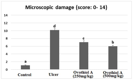 Histopathological score of stomachs of control, ulcer, ovothiol A (250 mg/kg) and (500 mg/kg). Data are expressed as the mean ± SE. a, b, c and d above the error bar indicate a significant difference.