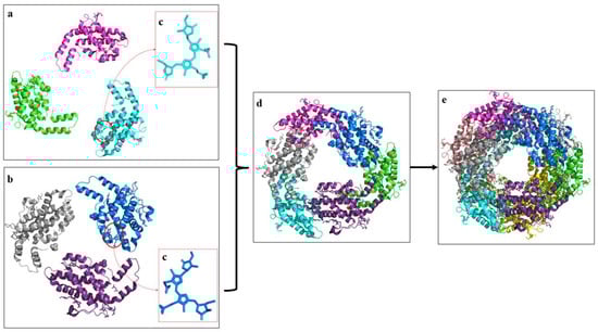 Atomic resolution structure (PDB ID: 5NB4) of C-phycoerythrin from Phormidium sp. (a) α-subunits; (b) β-subunits; (c) three-dimensional structure of phycoerythrobilin; (d) three-dimensional structure of trimer; (e) three-dimensional structure of hexamer (adopted from [] with permission, 2017, Sonani et al.).