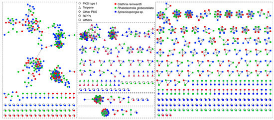 The predicted protein-coding genes were subjected to a search for secondary metabolite biosynthetic gene clusters (BGCs) using antiSMASH v.4.1.0 (bacterial version). The KnownClusterBlast function in antiSMASH was enabled to identify BGCs that are responsible for the biosynthesis of known compounds in the metagenomes of the sponge-associated bacteria. The predicted biosynthetic gene clusters were also searched for known biosynthetic pathways using the natural product domain seeker (NaPdoS) (http://napdos.ucsd.edu/, accessed on 15 August 2018). Biosynthetic gene cluster similarity networks and gene cluster families were generated using BiG-SCAPE with default settings. The networks were visualized using Cytoscape v. 3.6.0 (https://cytoscape.org, accessed on 28 August 2018) [135].