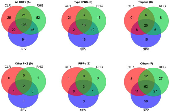 Venn diagrams of the identified GCFs from the metagenomes of three sponge-associated bacteria. CLR, Clathria reinwardti; RHG, Rhabdastrella globostellata; and SPV, Spheciospongia sp.