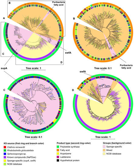The phylogeny of the KS sequences from the identified BGCs from sponge-associated bacterial metagenomes including KS sequences from the NaPDoS database and NCBI GenBank (A) and its subtrees (B–D).