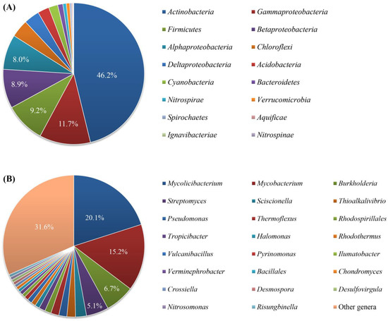 In addition, we used the BLASTX searches of the KS sequences to predict the bacterial taxa harboring these sequences and they were predicted to be related to KS sequences from diverse bacteria represented by 12 phyla, including Actinomycetes, Proteobacteria, Firmicutes, Chloroflexi, Acidobacteria, Cyanobacteria, Bacteroidetes, Nitrospirae, Verrucomicrobia, Spirochaetes, Aquificae, Nitrospinae, and Ignavibacteriae (Figure 4A, Tables S11–S13). Among them, Actinobacteria was the most predominant phylum (46.2% of the KS sequences), followed by the classes of Proteobacteria (3.5–11.7%) and the phylum Firmicutes (9.1%). Each of remaining phyla accounted for less than 5%. At the genus level, the KS sequences of the identified BGCs from the metagenomes were linked to 142 genera (Figure 4B). Of these, the genera Mycolicibacterium, Mycobacterium, Burkholderia, and Streptomyces were most dominant and accounted for 20.1, 15.2, 6.7, and 5.1% of the total KS sequences, respectively.