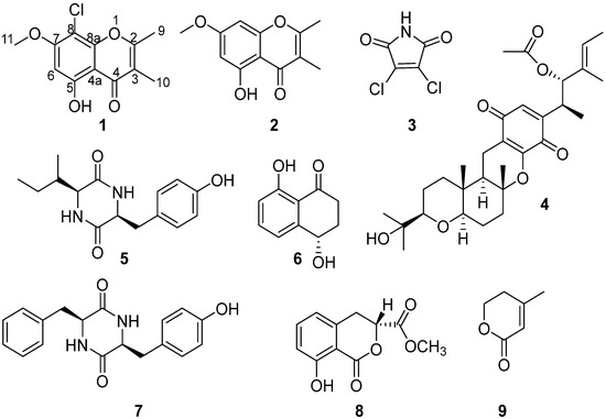16. Van Der Kerk, G.J.M.; Overeem, J.C. Mollisin, a dichloronaphthoquinone derivative produced by the fungus: Mollisia caesia. Recl. Trav. Chim. Pays-Bas. 1957, 76, 425–436. [Google Scholar] [CrossRef]