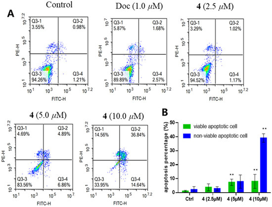 Figure 5. Compound 4 triggered PC-3 cells apoptosis in a dose-dependent manner (A,B). All results were presented as mean ± standard deviation (SD). Statistical significance was determined with One-Way ANOVA. ** p < 0.01 was considered statistically significant.