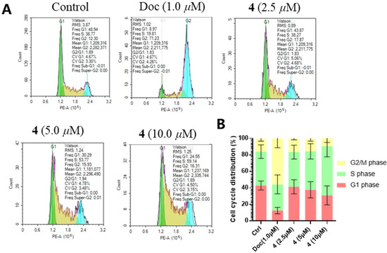 Figure 6. Compound 4 induced PC-3 cell cycle arresting at S phase (A,B). All results were presented as mean ± standard deviation (SD).