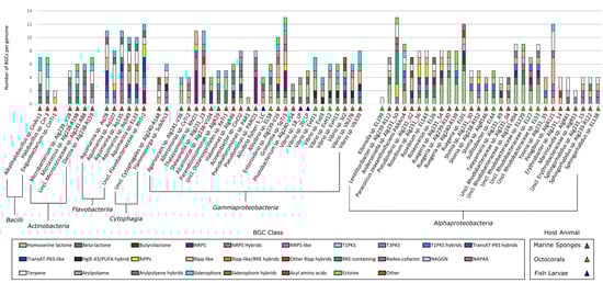 Secondary metabolite biosynthetic gene cluster (SM-BGC) counts for each of the 70 genome-sequenced marine bacterial isolates. SM-BGCs were grouped into 28 compound classes as shown in the legend. The order (left to right) in the legend corresponds to the order of appearance in the stacked bar chart (bottom to top). Original antiSMASH classification results are available in Table S7. The class-level taxonomic affiliation of isolates is indicated below the strain names. The host origin of each isolate is represented by a colored triangle next to the strain name: red—marine sponges, green—octocorals and blue—seabream larvae. NAGGN—N-acetylglutaminylglutamine amide; NAPAA—non-alpha poly-amino acids like e-polylysin; NRPS—non-ribosomal peptide synthetase; PKS—polyketide synthase; RiPP—ribosomally synthesized and post-translationally modified peptides. Uncl.—unclassified.
