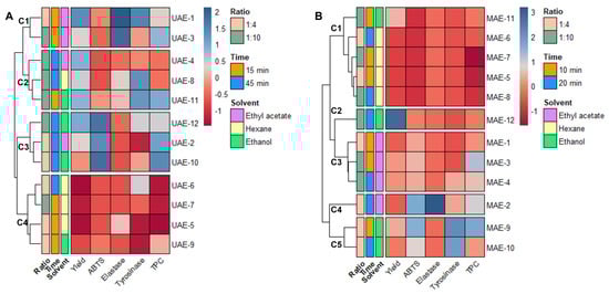 Data matrix obtained by combining the results of extraction and antiaging assays. The heatmap is organized by rows according to the Ward clustering algorithm (Euclidean Distance): (A) heatmap for ultrasound-assisted extraction; (B) heatmap for microwave-assisted extraction.