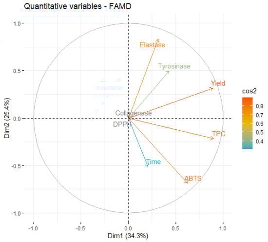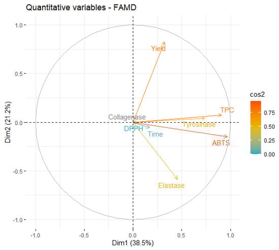 From Figure 4, it is possible to conclude that the information contained in most of the quantitative variables is retained in the first two dimensions, since the endpoint of their projection is closer to the circle. The first relationship that must be highlighted is the negative correlation between the yield and inhibition of elastase. However, this correlation is magnified by the fact that, in the original data, the only extract that presented some level of elastase inhibition was obtained in a very low yield.