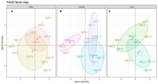 Plot of UAE individuals showing the distribution of samples across the dimensional space. Each panel shows the distribution centered in: (A) solid/liquid ratio, (B) solvent and (C) time of extraction. The shaded ellipsoids depict the 95% confidence ellipsis for outcomes as a function of dimensions 1 and 2.