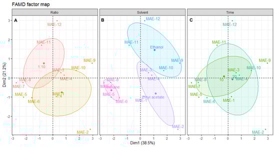 Plot of MAE individuals showing the distribution of samples across the dimensional space. Each panel shows the distribution centered in: (A) solid/liquid ratio, (B) solvent and (C) time of extraction. The shaded ellipsoids depict the 95% confidence ellipsis for outcomes as a function of dimensions 1 and 2.